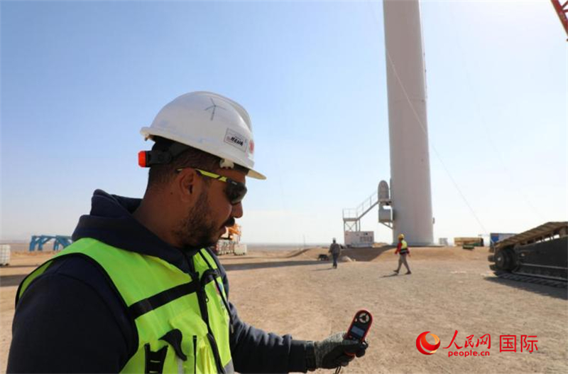 图为埃及工程师米纳在项目现场检测风速。人民网记者 沈小晓摄