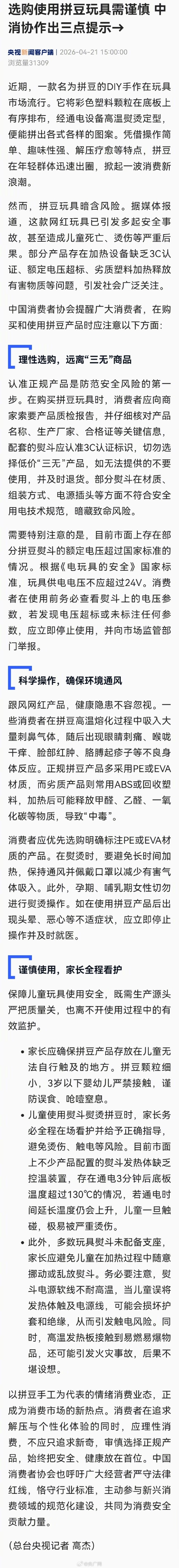 中国消费者协会提醒广大消费者,在购买和使用拼豆产品时应注意这些方面: