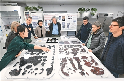日前,参加中意文化遗产保护修复国际圆桌会议的意方专家在中国社会科学院科技考古与文化遗产保护重点实验室参观了解科技考古与文物保护情况。 新华社记者李贺摄 意方专家在中国历史研究院图书档案馆文献修