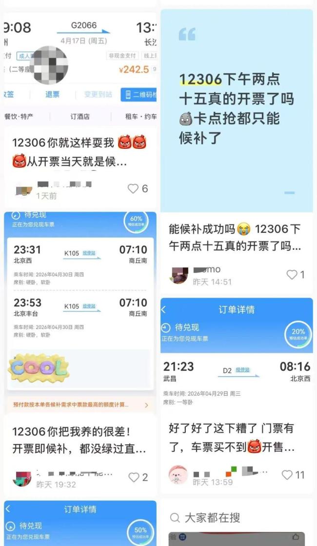 5月1日火车票今日开售。4月17日,许多网友在社交平台上表示遇到开票即候补的情况。客服提醒,如果用户提交了多个候补订单且其中一条已经兑现,其他订单因行程冲突将不再兑现。用户可以提前申请退款以避免产生手续费
