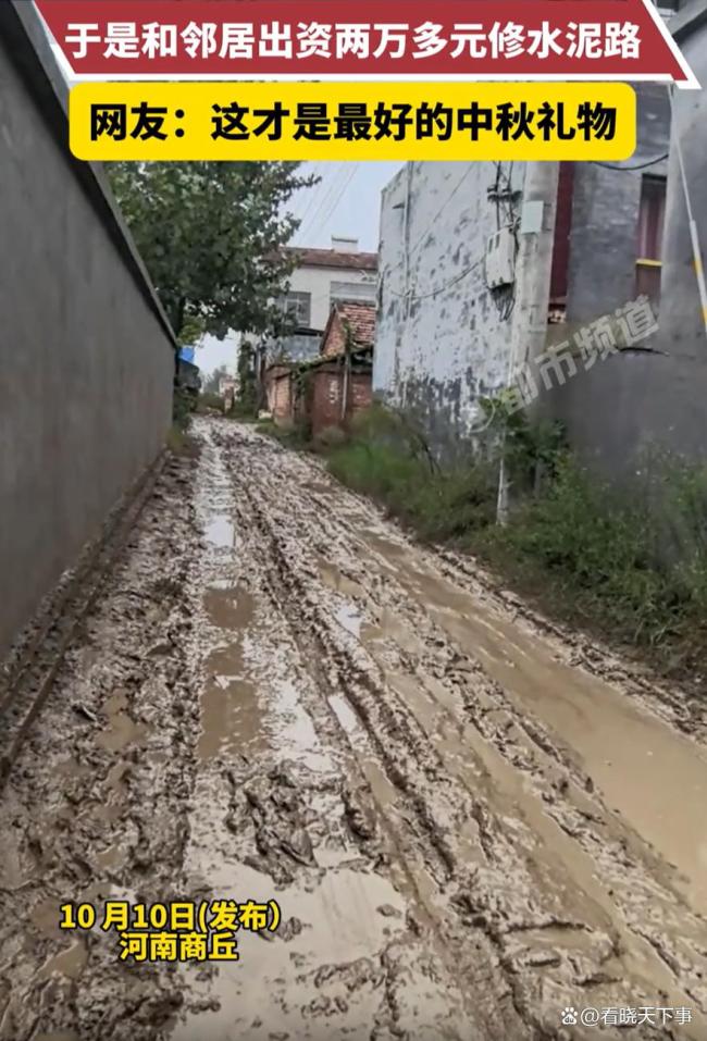 中秋假期,一名在外工作的男子回到河南老家,发现连日的雨水让村里的土路变得泥泞不堪。看到老人们艰难地在泥泞中行走,他心里很不是滋味,决定做点什么。他和邻居商量后,两家人凑了两万多元,请来工人拉水泥、拌料,开始修路