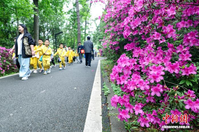 4月15日,园内盛开的杜鹃花吸引孩子们的目光。中新社记者 张畅 摄 4月15日,游客观赏盛开的杜鹃花。中新社记者 张畅 摄
