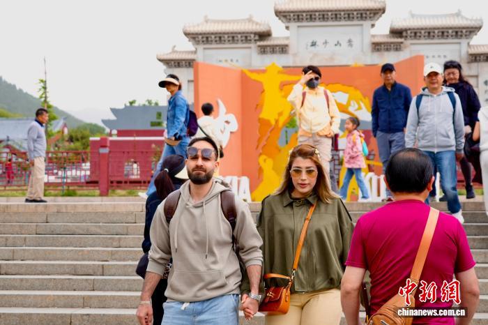 图为外籍游客在嵩山少林牌坊前漫步。中新社记者 李超庆 摄 图为外籍游客在少林寺山门前合影留念。中新社记者 范晓恒 摄