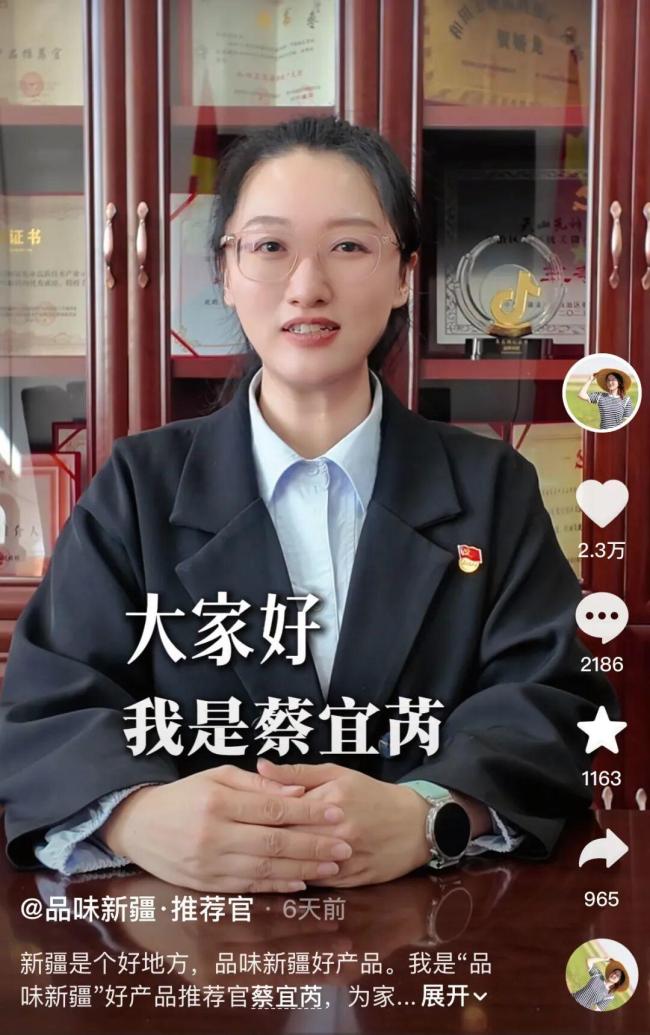 蔡宜芮来自新疆维吾尔自治区农业农村厅,她在“品味新疆·推荐官”账号上发布了一条视频,介绍自己将陪伴大家认识真正的新疆地道农特产。这条视频于4月14日发布,但起初并未引起太多关注