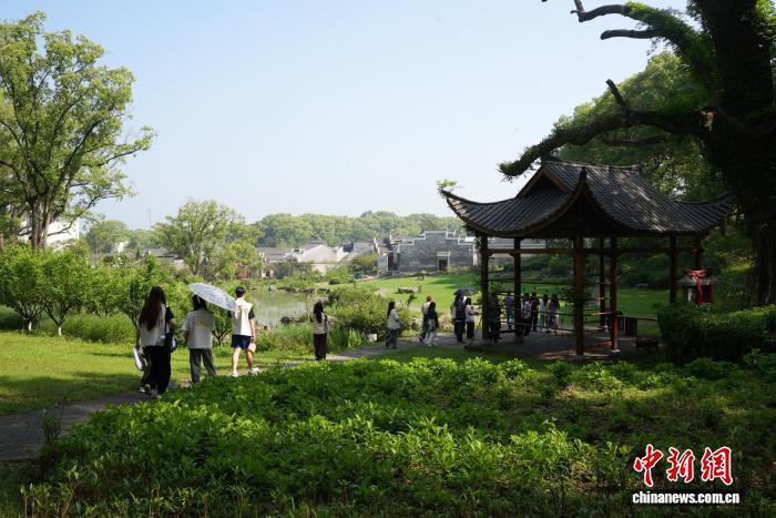 图为华侨大学港澳台侨学生在钓源古村行走。吴敏 摄 图为华侨大学港澳台侨学生在钓源古村环抱千年古樟。吴敏 摄