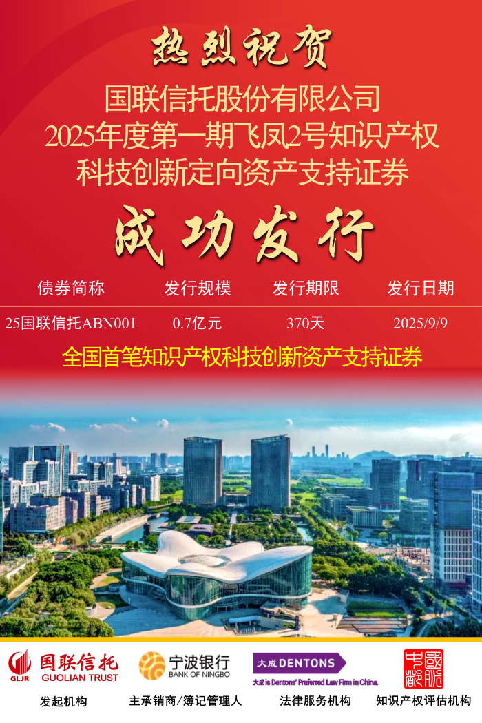 9月10日,由宁波银行独立主承销的“国联信托股份有限公司2025年度第一期飞凤2号知识产权科技创新定向资产支持证券”成功缴款起息,发行金额0.7亿元,期限370天。本期资产支持证券从启动注册到首期发行历经一年半有余