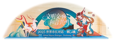 2025“世界市长对话·敦煌”会场布景。 本报记者宋朝军摄 中外嘉宾参加“世界市长对话·敦煌”开幕式。 新华社记者范培珅摄 外国嘉宾参观了解莫高窟风沙环境综合治理项目。 新华社记者范培珅