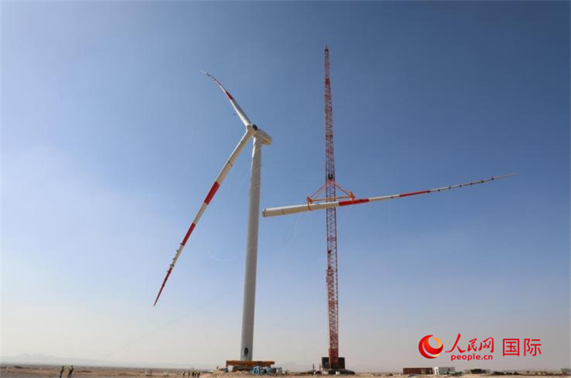 人民网开罗4月19日电(记者沈小晓)阳光下,巨型吊车将长约90米的风机叶片缓缓擎至百米高空,云朵低垂的天空映衬着中埃工人们浇筑和吊装的身影,重型卡车在临时道路上卷起阵阵沙尘……在埃及苏伊士湾的拉斯·加