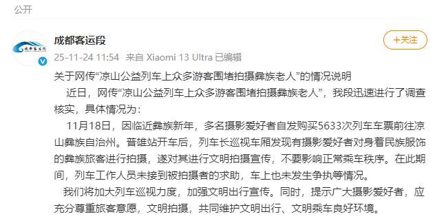 11月24日,成都客运段发布关于网传“凉山公益列车上众多游客围堵拍摄彝族老人”的情况说明。近日,网上传播了一则关于凉山公益列车上多名游客围堵拍摄彝族老人的消息
