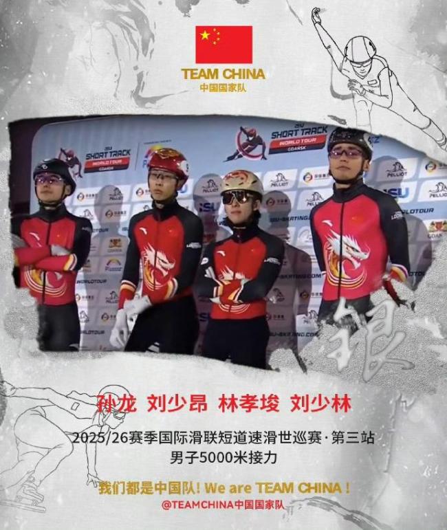 北京时间11月24日凌晨,2025-2026赛季短道速滑世巡赛第三站在波兰格但斯克结束。在男子5000米接力A组决赛中,由林孝埈、孙龙、刘少昂和刘少林组成的中国队以7分14秒517的成绩夺得银牌