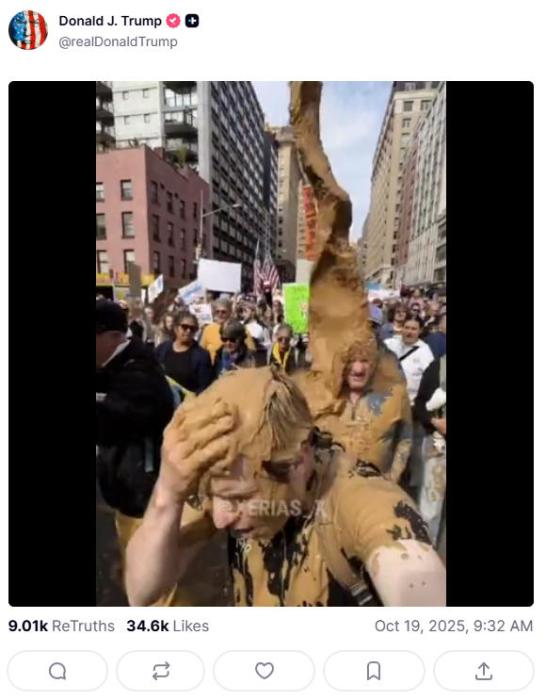 一场“泥浆雨”,从美国天空倾盆而下。 最近,美国总统特朗普发布了一段AI视频。画面中,他头戴王冠,驾驶战机,向游行人群投下褐色泥浆状物体。