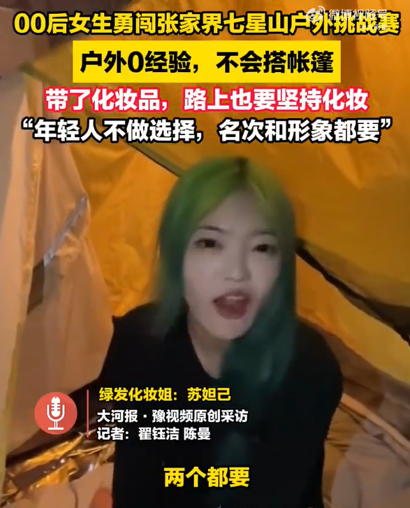 4月14日,张家界七星山·骆驼杯户外挑战赛(第一季)在张家界七星山景区正式开赛。“绿发化妆姐:苏妲己”在现场接受采访时表示,自己户外0经验,不会搭帐篷,此次来参加比赛还带了化妆品,路上也要坚持化妆。她还称:年轻人不做选择,名次和形象都要。0...