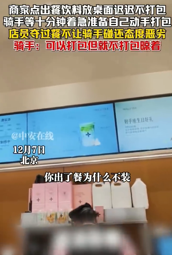 12月7日,一段发生在北京的外卖取餐纠纷视频在网络上引发关注。视频显示,一名外卖骑手按订单到店取餐后,发现餐品早已制作完成,却被放在操作台上迟迟未打包。骑手在现场等待将近十分钟,期间多次观察到餐已备好但无人处理,配送时间不断被压缩,情绪逐渐...